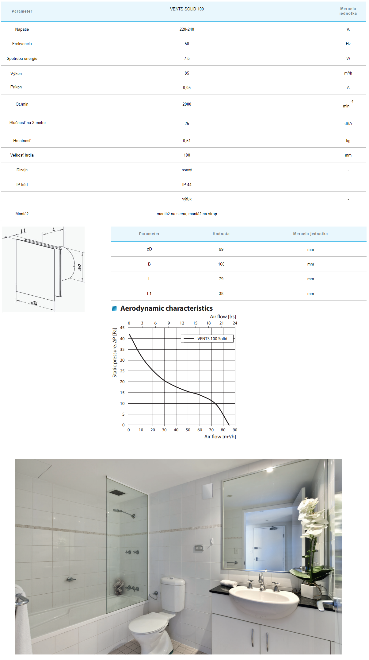 Kúpeľňový ventilátor VENTS 100 Solid s výkonom 85 m³/h a priemerom 100 mm je navrhnutý na trvalé alebo prerušované vetranie v sprchách, kúpeľniach, kuchyniach a iných obytných priestoroch.