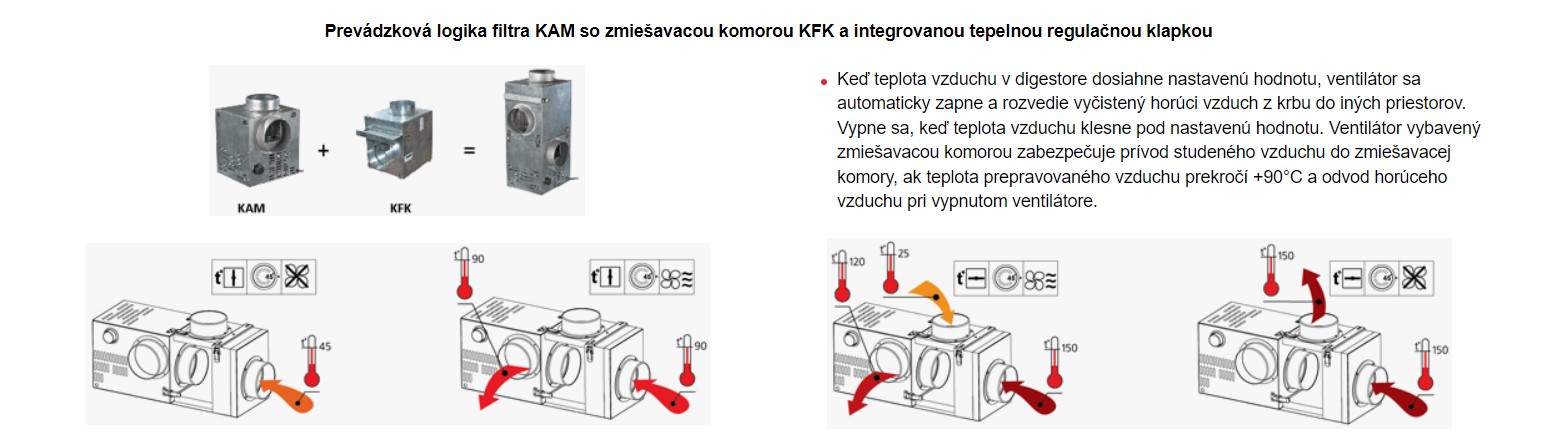 Keď teplota vzduchu vo ventilátore dosiahne nastavenú hodnotu, krbový ventilátor sa automaticky zapne a rozvedie horúci vzduch z krbu do iných priestorov. Vypne sa, keď teplota klesne pod nastavenú hodnotu.
