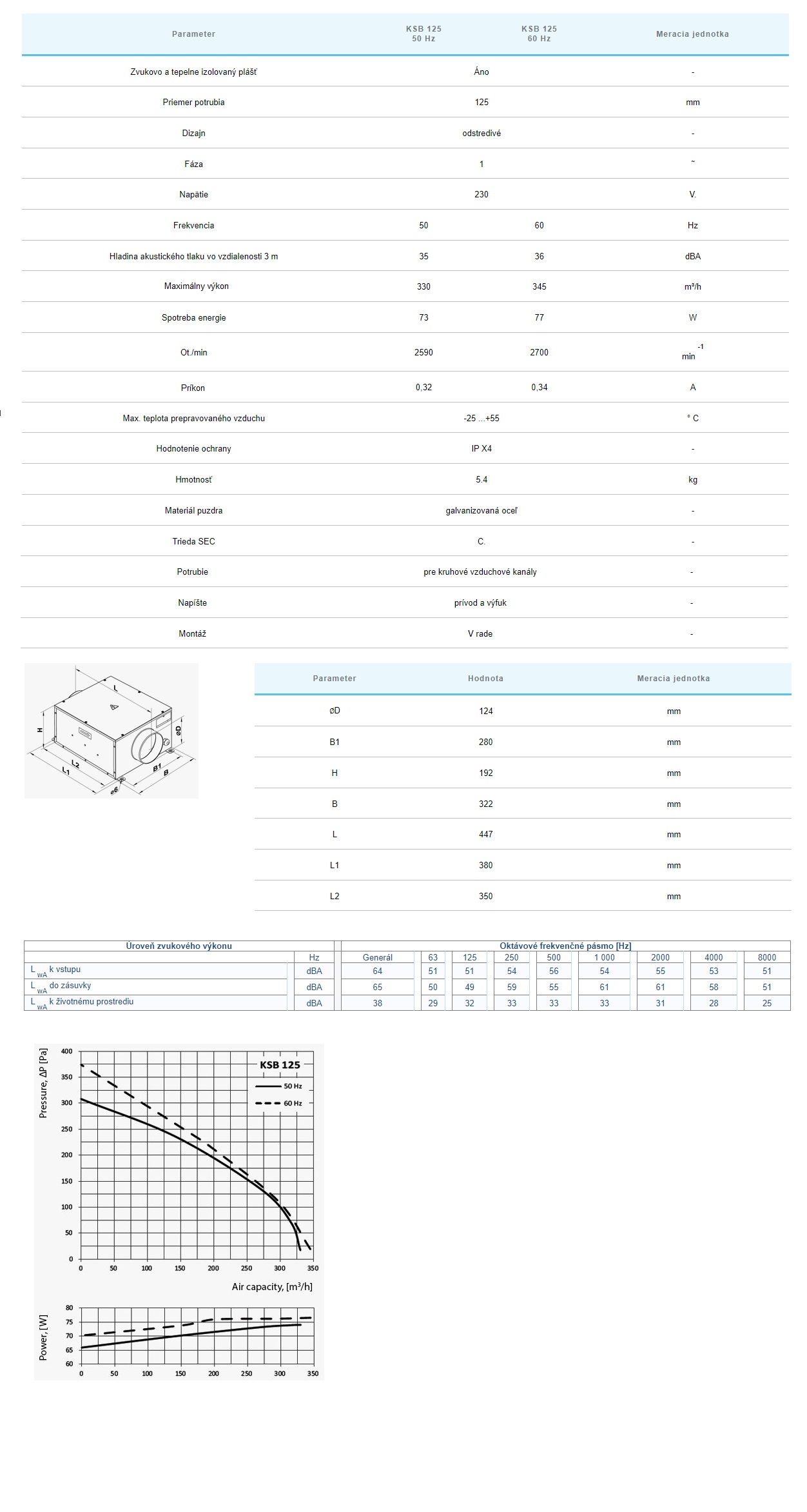 Tichý radiálny ventilátor VENTS KSB Ø125mm s výkonom 330m3/h je navrhnutý pre umiestnenie do podhľadov a iných ťažko prístupných priestorov. Kryt ventilátora je vyrobený z Aluzinkového plechu, zatiaľ čo tepelne a zvukovo izolačná vrstva je z penového polystyrénu. Obežné koleso je vyrobené z pozinkovanej ocele s dopredu zahnutými lopatkami a je poháňané 2 pólovým asynchrónnym motorom. Motor je vybavený guličkovými ložiskami pre dlhšiu životnosť a každé obežné koleso je dynamicky vyvážené pre presnú funkčnosť a bezpečnú prevádzku. Krytie motora je IP 44.
