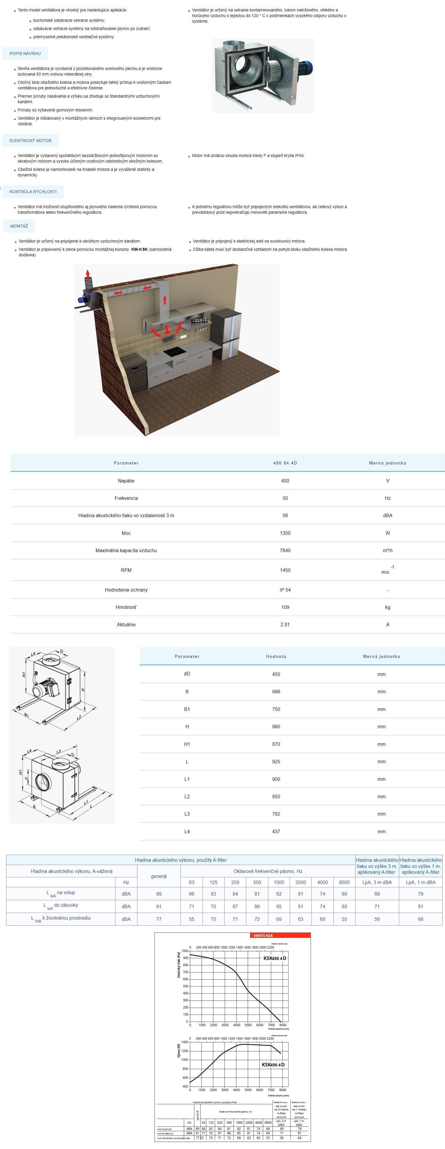 VENTS KSK 450 4D – priemer 450 mm, výkon 7840 m3/h, prevádzková teplota do 120 °C, 400V.