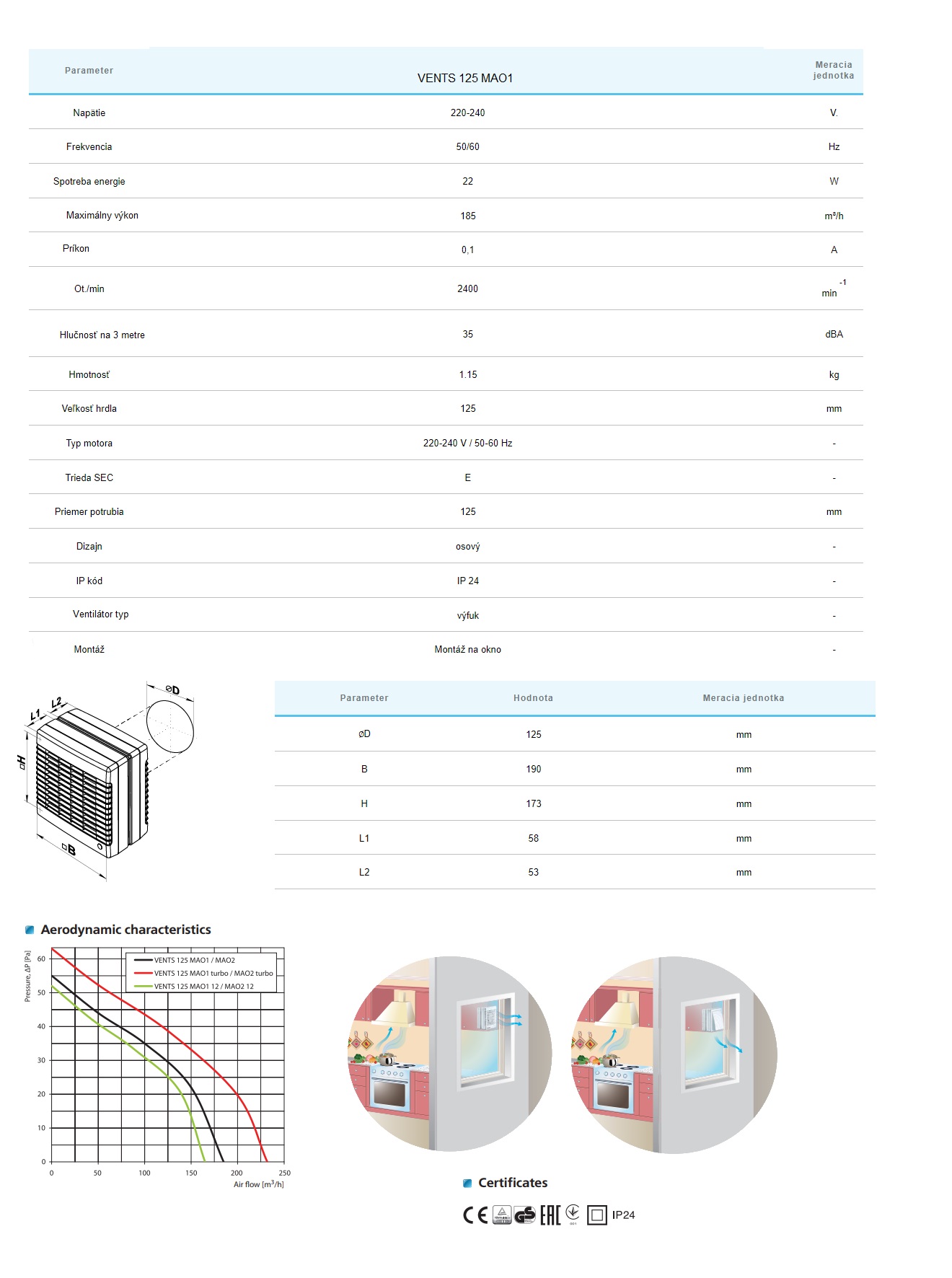 Ventilátor do okna VENTS MAO1TH s priemerom 125 mm a výkonom 185 m³/h, napájanie 230 V. Tento ventilátor je vybavený časovým dobehom a senzorom vlhkosti, čo umožňuje kontinuálne alebo periodické odsávanie vzduchu v kúpeľniach, spŕch, kuchyniach a ďalších úžitkových priestoroch. Je určený na montáž do okien.