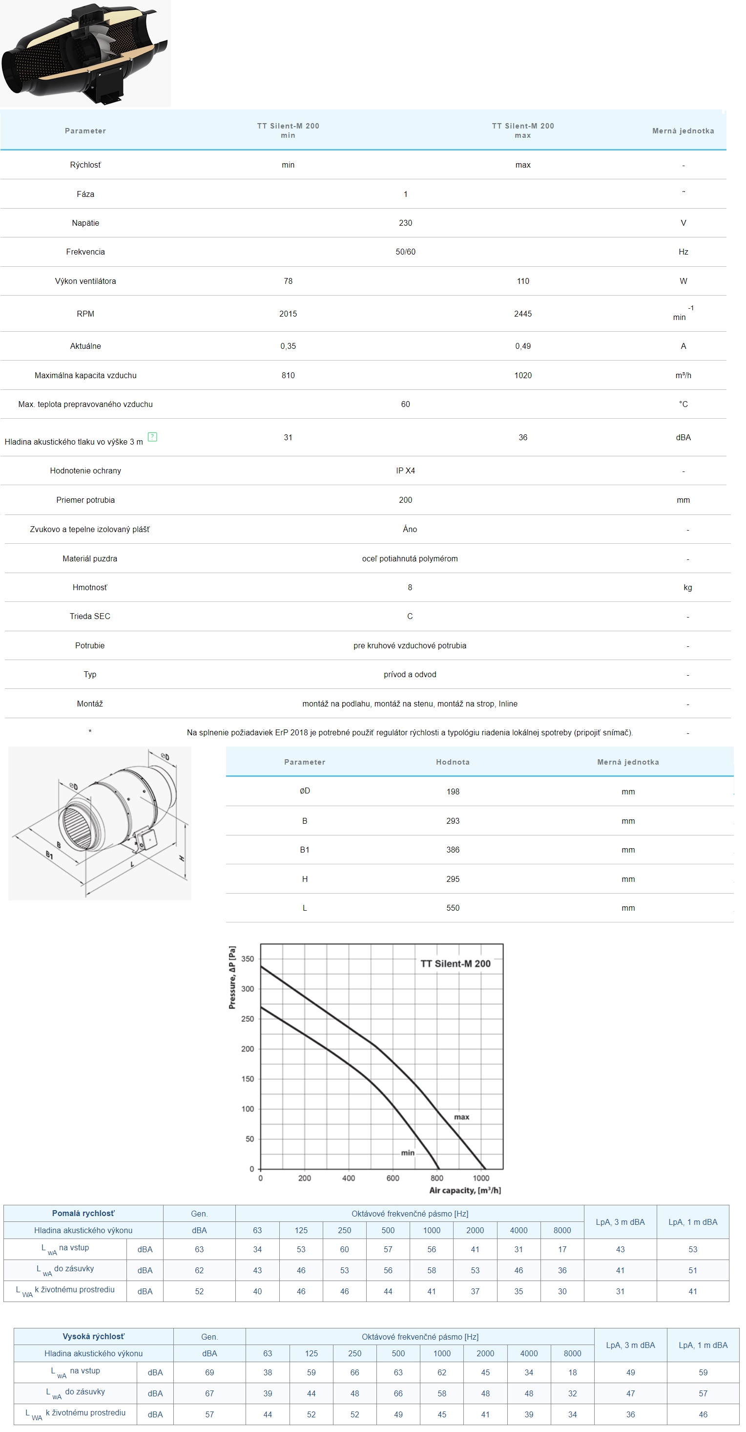 Priemyselný ventilátor VENTS TT-Silenta M 200 s priemerom napojenia 198 mm a výkonom 810 m³/h a 1020 m³/h pri napätí 230V je umiestnený v špeciálne navrhnutej zvukovo izolovanej skrini, ktorá zaisťuje tichý chod ventilátora v kombinácii s vysokými aerodynamickými vlastnosťami. Priemyselný ventilátor je kompatibilný s guľatými vzduchovými potrubiami Ø 200 mm. TT Silent-M poskytuje silné prúdenie vzduchu a vysoký tlak.