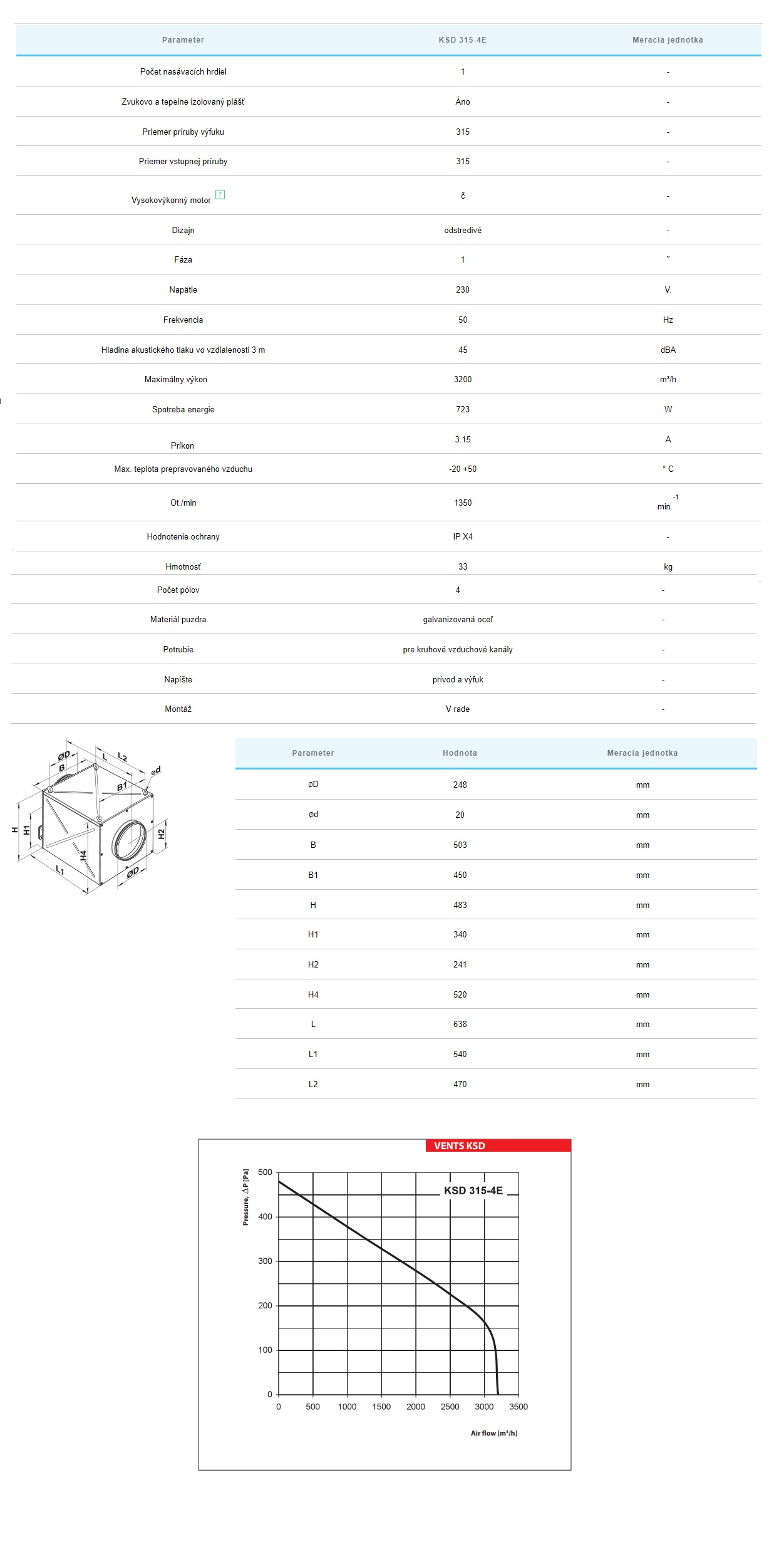 Radiálny ventilátor VENTS KSD Ø315 mm s výkonom 3200 m³/h je určený na tiché odvetranie miestností s vyššími nárokmi na hluk. Plášť ventilátora je vyrobený z pozinkovaného oceľového plechu a tepelne a zvukovo izolačného materiálu. Priemyselný ventilátor je vybavený 4-pólovým asynchrónnym motorom s dvojitým vstupným obežným kolesom a lopatkami zakrivenými vpred. Motor má ochranu proti prehriatiu s automatickým reštartom. Vzhľadom na špeciálne mazivo v guličkových ložiskách je ventilátor bezúdržbový a prevádzka je tichá. Ventilátor je určený na montáž s kruhovým rozvodom a je možné ho inštalovať v ľubovoľnej polohe podľa smeru pohybu vzduchu (znázornené ukazovateľom na skrini ventilátora). Pri montáži je potrebný dostatočný priestor pre údržbu ventilátora.