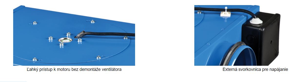 Kryt ventilátora je vyrobený z ocele s polymérnym povlakom. Minimálna výška krytu umožňuje montáž ventilátora v obmedzenom priestore. Odnímateľný kryt poskytuje voľný prístup k motoru, zaisťuje jednoduchú montáž a umožňuje údržbu ventilátora a vzduchového potrubia bez demontáže.