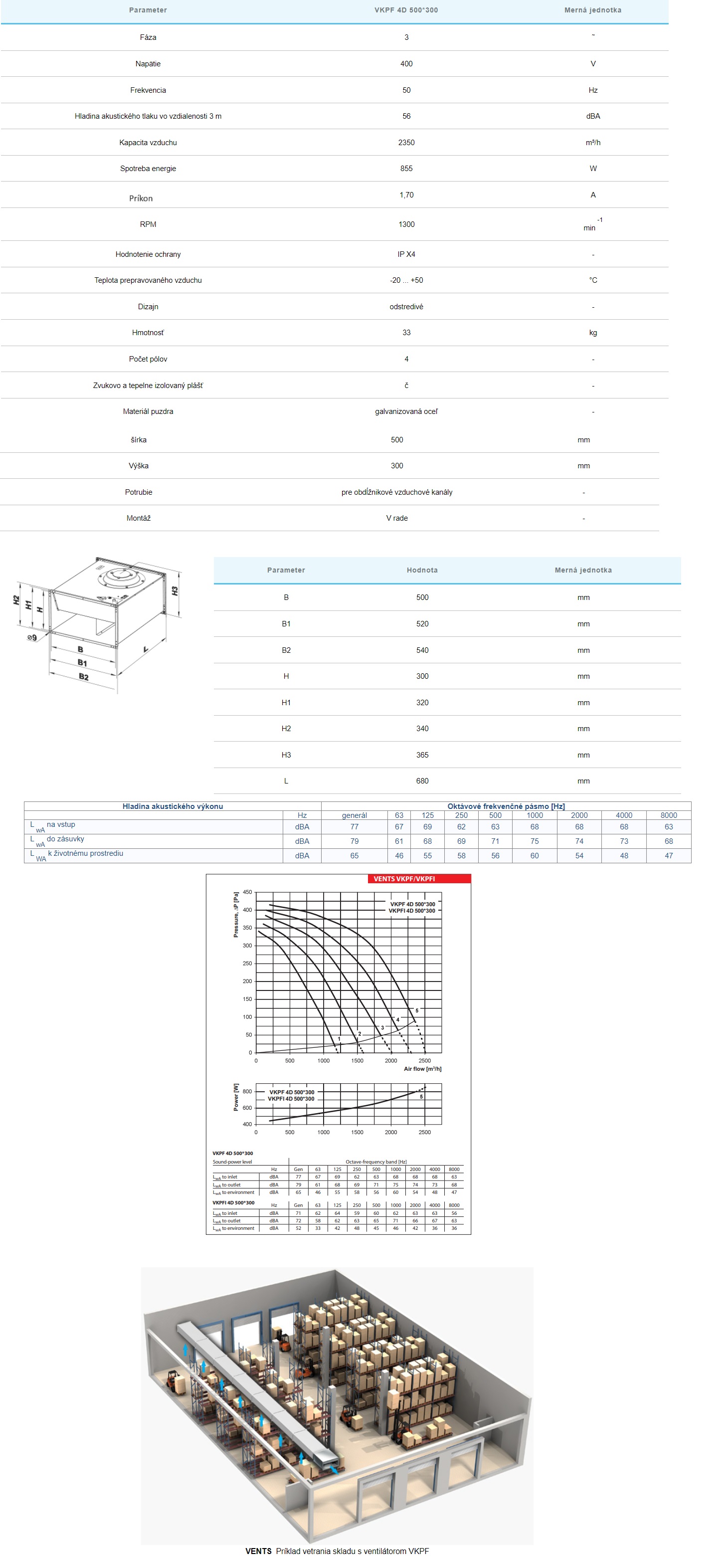 Trojfázový priemyselný radiálny ventilátor VENTS VKPF 4D s výkonom 2350 m³/h je ideálny pre systémy prívodu a odvodu vzduchu v obchodných, kancelárskych a iných verejných alebo priemyselných priestoroch, kde je obmedzený priestor na inštaláciu. Ventilátor je určený pre pripojenie na obdĺžnikové vzduchové potrubie s rozmermi 500×300 mm.