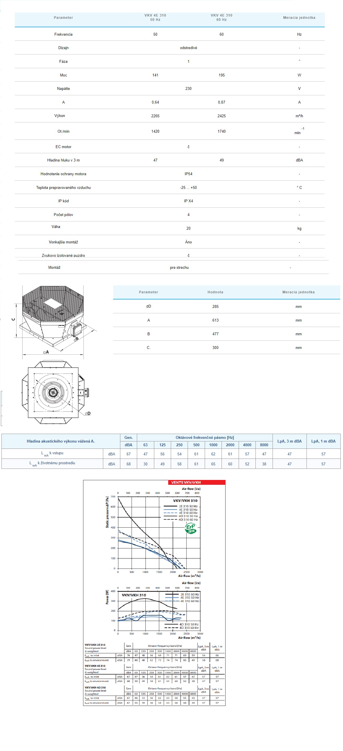 Priemyselný strešný ventilátor VENTS VKV 4E 310 s výkonom 2265m3/h, určený na odvodné vetracie systémy. Kompatibilný so vzduchovými kanálmi a vhodný pre všetky typy striech.