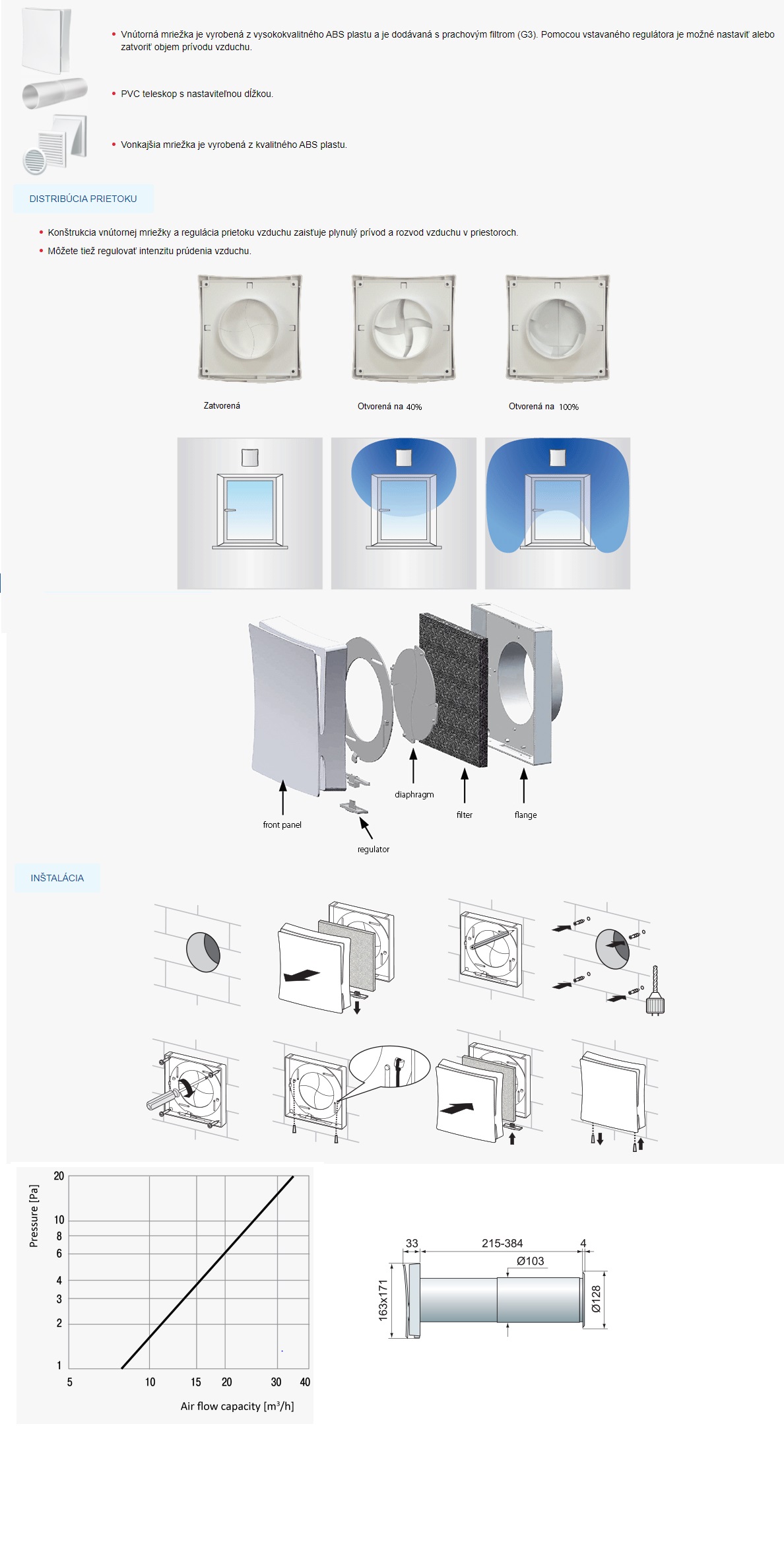 Špeciálne navrhnutá konštrukcia vnútornej mriežky a regulácia prietoku vzduchu zaisťuje plynulý prívod vzduchu a jeho distribúciu. Hladké miešanie teplého a studeného vzduchu v zime zabraňuje nadmernej vlhkosti a zaisťuje samoreguláciu klímy v priestoroch.