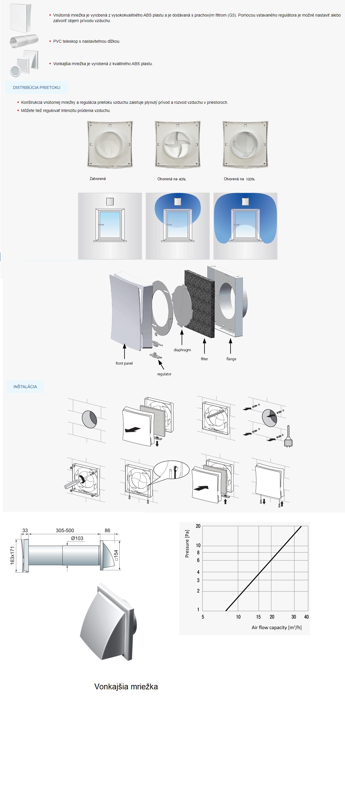 KONŠTRUKCIA A NÁVRH Nástenný prieduch pozostáva z 2 vetracích mriežok (vnútornej a vonkajšej) a teleskopického potrubia.