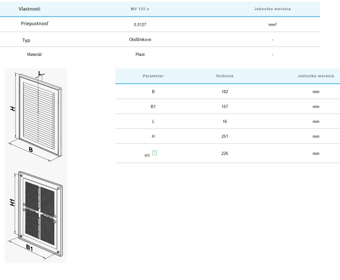 Vetracia mriežka MV125S, plastová biela so sieťkou proti hmyzu. Rozmer: 182x251mm, materiál: ABS plast, odolný proti UV žiareniu. Vetracia mriežka je vyrobená z kvalitného a odolného plastu. Vnútorná časť je pripevnená k základni pomocou západiek pre ľahké čistenie bez demontáže. Upevnenie pomocou skrutiek.