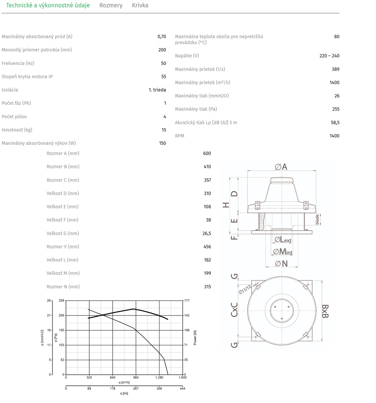 Vortice TRM 15 E 4P – 200mm Strešný ventilátor s výkonom 1400 m³/h. Špecifikácie: Priemer: 200 mm, Materiál: Kovový kryt, polyesterová vrstva, Max. prúd: 0,70 A, Max. výkon: 150 W, Počet fáz: 1, Počet pólov: 4, Frekvencia: 50 Hz.