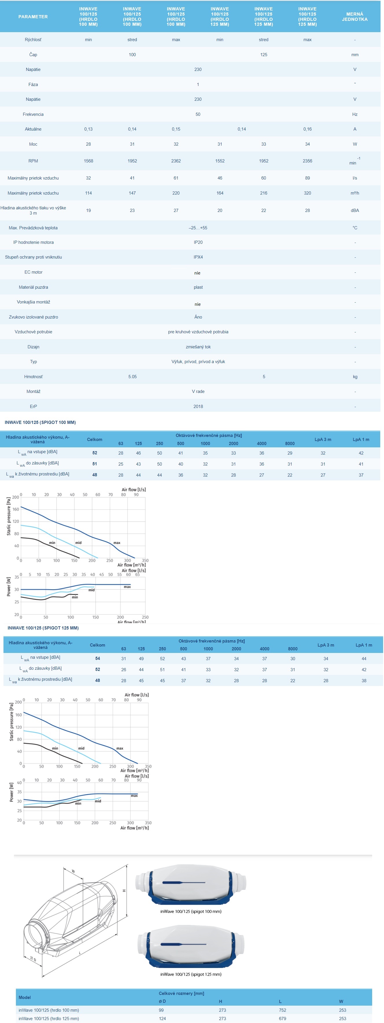 Blauberg inWave 100/125 – výkon s redukciou 100mm-114-147-220m3/h s hrdlom 125mm-164-216-320m3/h. Systémy prívodu a odvodu vetrania sú určené pre priestory s vysokými požiadavkami na hladinu hluku. Ventilátory sú vhodné pre vzduchové kanály ∅ 100 až ∅ 125 mm. Kryt je vyrobený z kvalitného plastu, vnútorne vyplnený 50 mm tepelnou a zvukovo izolačnou vrstvou. Špeciálna perforácia plášťa a zvukovo izolačný materiál sú navrhnuté na širokofrekvenčné pohlcovanie zvuku. Obežné koleso so zmiešaným prietokom je vyrobené z vysokokvalitného plastu. Difúzor a usmerňovacie lopatky zaisťujú vysoký výkon a nízku hlučnosť. Externá vzduchotesná svorkovnica na skrini ventilátora pre napájanie. Montážne konzoly na kryt ventilátora umožňujú montáž na podlahu, stenu alebo strop.